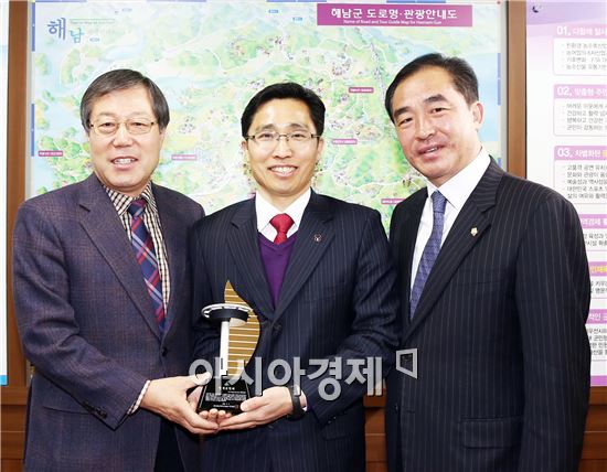 박철환 해남군(왼쪽)수가 3일 군수실에서 곽민섭 지원장(가운데)에게 명예군민패를 수여했다.<br />