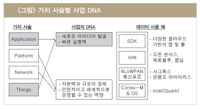 사물 인터넷으로 새롭게 추가된 소물 인터넷소물 인터넷을 위한 다양한 시도들은 이미 시작돼소물과 앱은 스타트업과 같은 조직, 네트워크와 플랫폼은 안정적 운영이 강한 조직이 유리[아시아경제 이초희 기자]사물인터넷(IoT)에 대한 관심이 높아지고 있는 가운데 기존 PC, 스마트폰의 연결과 달리 저성능 컴퓨팅 파워 기반의 소물(Small Things)과 소량의 데이터 트래픽들이 모여 새로운 가치를 만들어 내는 '소물인터넷'시장이 형성되고 있다. 소물인터넷은 기존 스마트폰 연결 환경과는 다른 별도의 가치 사슬이 생성되고 있으며 작고 빠르게 움직일 수 있는 스타트업과 같은 조직이 복잡한 내부 학습과정과 의사결정 프로세스가 있는 큰 조직보다 유리할 수 있다고 예측했다.4일 신동형 LG경제연구원 책임연구원은 '저성능의 소물인터넷이 사물인터넷의 지평 넓힌다'라는 보고서를 통해 스마트폰을 잇는 정보통신기술(ICT) 산업의 새로운 성장 동력으로 기대되는 사물인터넷의 제품들은 온도, 습도, 각도, 무게, 위치 등 단순 정보를 측정, 처리하는 소물 들이 대부분이라고 설명했다. 보고서에 따르면 글로벌 통신 표준화 기구인 국제전기통신연합(ITU)은 사물인터넷을 '이미 존재 또는 진화하고 있는 상호 호환 가능한 물리적 또는 가상의 사물들이 연결된 새로운 정보화사회를 위한 글로벌 인프라'로 정의했다. 또 인터넷 표준화 기구인 IETF도 '사물 인터넷은 표준에 기반한 고유 식별 가능한 사물들이 상호 연결된 글로벌 네트워크'로 정의했다.신 연구원은 "연결성이 확대되면 지금까지 연결을 주도해 온 PC, 스마트폰보다 더 다양한 형태와 특징을 가진 사물들이 연결될 것"이라며 "그 모습은 MIT 테크놀리지 리뷰의 사물인터넷 정의에서 힌트를 얻을 수 있다"고 설명했다. 이들은 '사물인터넷은 저성능(Dumb)을 포함한 소형 컴퓨터가 사물에 부착된 컴퓨터 환경이다. 사물들은 컴퓨터를 통해 주변환경을 감지해 데이터를 생성하고 그 데이터를 송수신 또는 제어할 수 있는 수단을 제공한다'라고 정의했다.신 연구원은 "여기서 '저성능'에 주목할 필요가 있다"고 강조했다. 네트워크 제조사인 시스코는 사물 인터넷으로 인해 지금까지 연결된 적이 없는 99%의 물리적 개체들까지 향후 인터넷에 연결될 것이라고 예상했다.그는 앞으로 추가적으로 연결될 대상으로는 냉장고, 세탁기와 같은 가전 제품과 조명기기 등 이미 연결되고 있는 기기들뿐만 아니라 숟가락(손떨림 보정·리프트웨어), 젓가락(유해 음식 판별), 유리컵(칼로리 및 음료량 측정·베실)까지도 포함될 것이라고 전망했다. 제품자체가 직접 연결될 수도 있지만 연결 기능에충실한 작은 기기인 동글(Dongle)과 함께 더 많은 소물들이 연결된다고 볼 수 으며 저성능 컴퓨팅 파워 기반의 소물들이 연결된 소물 인터넷은 기존의 PC, 스마트폰, 태 블릿PC 등으로 연결된 환경과는 다를 것으로 새로운 아이디어가 접목된 소물들은 다양한 경로를 통해 끊임없이 출시되고 있다고 밝혔다.신 연구원은 "기존의 스마트 기기들은 한 기기에서 더 많은 기능들을 융합해 구현할 수 있어야 하므로 고성능 컴퓨팅 파워가 필요하다"며 "사용 주체가 사람이기 때문에 사람이 생산, 소비할 수 있는 멀티미디어 콘텐츠 중심으로 활용돼 왔다"고 설명했다. 즉, 기기의 스크린은 크면 클수록 사용성이 좋고 대용량 데이터를 송수신하기 때문에 데이터 전송속도는 빠르면 빠를수록 좋다는 것이다.이에 비해 소물인터넷은 저성능 기반의 소물들이 주변 환경을 능동적으로 감지하는 등 그 주체가 사람이 아니라 사물인 연결 환경이라고 밝혔다. 저성능 컴퓨팅 파워 기반의 소물들이 생성한 데이터의 저장과 분석은 소물에 저장되기보다 대용량 저장소인 클라우드에서 진행될 것이라는 설명이다. 이에 따라 네트워크는 소량·저속이어도 그리고 스크린은 없어도 무방할 것으로 내다봤다..그는 "소물인터넷과 관련된 다양한 시도들은 이미 시작·전개되고 있다"며 "소물의 반도체, 네트워크, 플랫폼 그리고 소물인터넷을 위한 새로운 서비스 등이 그것이다"고 말했다.보고서에 따르면 소물 인터넷도 단순히 소물 하나가 그 역할과 가치를 제공한다기보다는 새로운 시스템, 즉 가치 사슬과 연결돼 제공된다. 모바일의 연장선상에서 사물 인터넷을 접근한다면 가치사슬은 A(Appl ic ation)-P(Platform)-N(Network)-T(Things)로 나눌 수 있다. 스마트볼, 노크, 플렉시드론, 플릭, 블루스마트 등 다양한 아이디어가 적용된 소물들은 가치 사슬 중 사물에 해당될 것이라는 설명이다. 이들 소물들은 현재 스마트폰 앱을 통해서 모니터링되고 제어되며 사용된다. 사물 인터넷 전용망인 시그폭스와 온램프와이어리스 등은 네트워크에 해당된다. ARM 및 인텔의 새로운 반도체들은 사물의 머리에 해당되는 반도체와 OS를 제공한다. 오픈센서스, 옥토블루, 펍넙 등은 플랫폼인 클라우드에 해당된다. 클라우드는 사물들을 표준 네트워크 기술로 연결시키고, 사물들로부터 데이터를 수집하여 앱을 통해 서비스가 제공될 수 있도록 지원해 준다.신 연구원은 "이러한 가치 사슬 내 영역들은 각각 다른 사업 특징을 가질 것으로 보인다"며