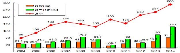 최근 10년(2004~2014년) 사이 마약류 단속실적 흐름 그래프
