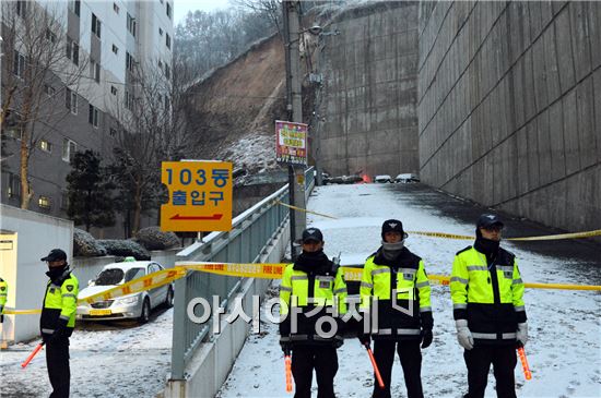 광주광역시는 5일 남구 봉선동 대화아파트 뒤편 도로 옹벽 붕괴 사고 현장에 재난안전대책본부를 가동하고, 추가 붕괴가 우려됨에 따라 주민 출입을 통제했다. 사진제공=광주시 <br />