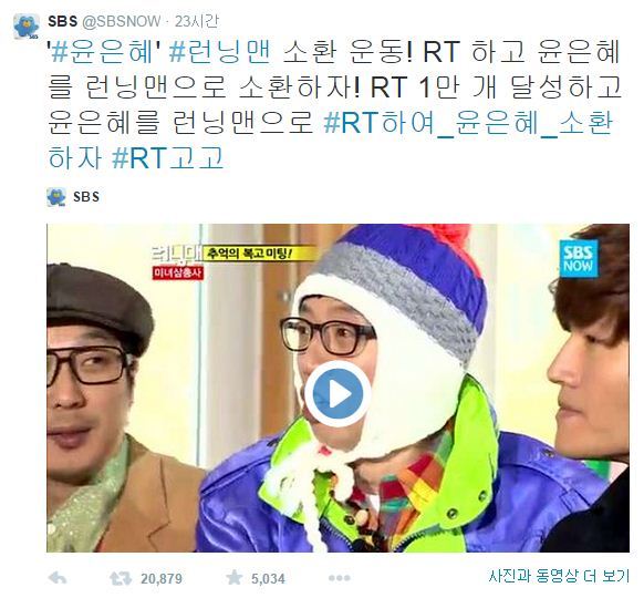 SBS 측, '런닝맨'서 김종국♡윤은혜 재회 추진…"런닝맨 나와 주실거죠?[아시아경제 온라인이슈팀] SBS 측이 공식 SNS에 윤은혜와 김종국의 재회를 주선하기 위한 '윤은혜 소환운동' 글과 영상을 게재했다.5일 SBS는 공식 트위터 계정으로 "#윤은혜 #런닝맨 소환 운동! RT(리트윗)1만개 달성하고 윤은혜를 런닝맨으로 소환하자"라는 글과 영상을 남겼다.트위터에 첨부된 영상에는 그동안 '런닝맨'에서 윤은혜를 언급한 장면 등이 편집돼 담겼다. 영상은 과거 SBS 'X맨 일요일이 좋다'에서 김종국과 함께 출연한 윤은혜의 모습과 함께 "윤은혜 씨, 런닝맨 나와 주실거죠?"라는 멘트로 마무리됐다.6일 오전 11시 현재 해당 트윗은 리 트윗 2만회가 넘었다.윤은혜와 김종국은 지난 2006년 방송된 SBS 'X맨 일요일이 좋다'에서 러브모드를 형성하며 '원조 예능 커플'로 불린 바 있다.온라인이슈팀 issue@asiae.co.kr<ⓒ세계를 보는 창 경제를 보는 눈, 아시아경제(www.asiae.co.kr) 무단전재 배포금지>