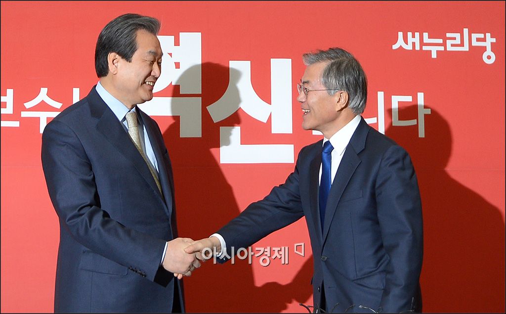[아시아경제 윤동주 기자] 문재인 새정치민주연합 신임 당 대표가 9일 서울 여의도 국회 새누리당 대표실에서 김무성 대표와 만나 악수를 나누고 있다.윤동주 기자 doso7@asiae.co.kr<ⓒ세계를 보는 창 경제를 보는 눈, 아시아경제(www.asiae.co.kr) 무단전재 배포금지>
