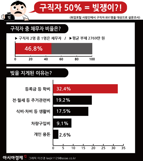 구직자 절반이 '채무자', 평균 2769만원…'학비'가 가장 커 [아시아경제 온라인이슈팀] 신입사원으로 입사를 준비하는 구직자 2명 중 1명은 채무자라는 조사결과가 나와 눈길을 끌었다. 9일 취업포털 사람인은 구직자 891명을 대상으로 설문조사한 결과 46.8%가 빚이 있다고 답했으며, 이들의 평균 부채는 2769만원으로 집계됐다고 밝혔다. 남성 구직자의 빚이 2924만원으로 여성 구직자의 채무(2218만원)보다 700만원정도 많았다.빚을 지게 된 이유로는 '등록금 등 학비'(32.4%)가 1위를 차지했다. 이어 '전·월세 등 주거관련비'(19.2%), '식비·차비 등 생활비'(17.5%), '차량구입비'(9.1%), '개인 용돈'(2.6%) 순으로 조사됐다.빚이 미치는 영향으로는 '자주 우울해진다'(38.6%·복수응답)는 답변이 가장 많았다. '연봉 등 경제조건 우선해 진로를 고려하게 된다'(37.2%)가 그 다음이었다. 이 밖에도 '빨리 취업하기 위해 묻지마 지원하게 된다'(33.1%), '지출 부담으로 스펙 준비를 제대로 못 하게 된다'(24.2%), '취업에 대한 자신감을 상실하게 된다'(23.5%) 등의 응답이 있었다. 돈을 빌린 곳은 대부분 제1금융권(29.7%)이나 정부(27.6%)였다. 하지만 제2금융권(14.2%)이나 대부업체(10.6%), 카드연체(5.5%)라고 답한 구직자도 있었다.빚을 모두 갚는 데는 평균 5년6개월이 걸릴 것으로 구직자들은 예상했다.온라인이슈팀 issue@asiae.co.kr<ⓒ세계를 보는 창 경제를 보는 눈, 아시아경제(www.asiae.co.kr) 무단전재 배포금지>