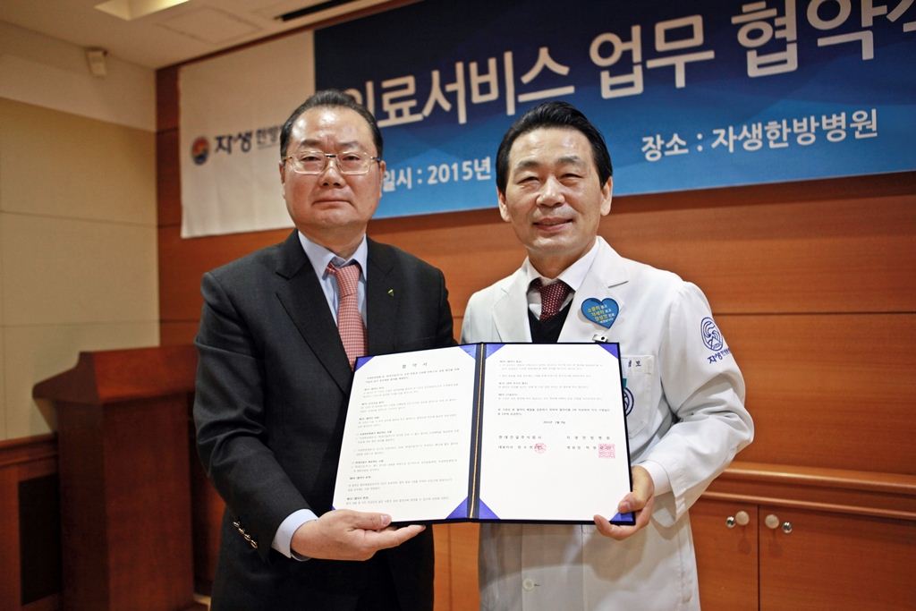 박병모 자생한방병원 병원장(왼쪽)과 김재경 현대건설 전무가 9일 임직원 척추건강을 위한 협약서를 교환하고 있다]