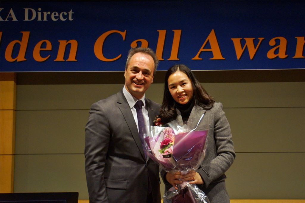 자비에 베리 악사다이렉트 사장(왼쪽)과 골든콜 시상식 대상 수상자인 부산 콜센터 소속 상담원 김은주씨가 기념촬영을 하고 있다.