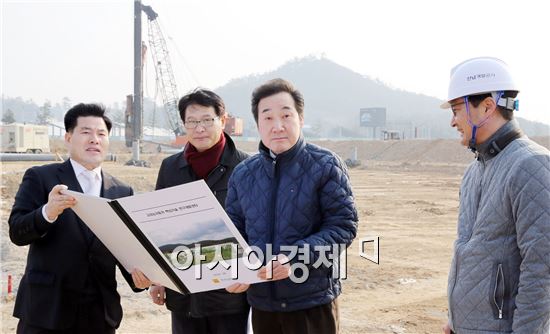 이낙연 전남도지사가 10일 오전 영암군 삼호읍 삼포리(F1경주장 인근) 고성능자동차핵심기술연구개발센터 건립공사 현장을 방문, 주동식 일자리정책실장(왼쪽 두 번째)으로부터 연구지원동ㆍ평가장비동ㆍ전기실동 등 건립 신축에 대한 설명을 듣고 있다. 고성능자동차핵심기술연구개발센터는 F1경주장을 연계한 차부품 고급브랜드화 연구개발을 하게 된다. 사진제공=전남도
