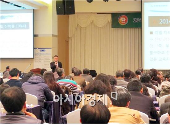 "특성화고 취업률 75%달성 취업관계자 협의회 참가 성료"[아시아경제 노해섭 기자]전라남도교육청(교육감 장만채)은 10일 오후 전라남도교육연구정보원 5층 합동강의실 및 5개 연수실에서 전남지역 특성화고 취업관계자(교감·취업부장·취업지원관 등) 150여명 참석한 가운데 ‘취업률 75% 달성과 취업 유지율 제고 취업관계자 협의회’를 실시했다.교육국장은 인사말에서 “전남교육의 성공열쇠는 우리청 역점사업인 고교 교육력 제고에서 특성화 고등학교의 취업중심 교육과정운영이다"며 "이를 위해서 능력위주의 고졸 취업시대에 부응해 도내 특성화고 학생들이 자존감을 가슴에 새기며, 무작정 대학진학이라는 기존의 교육관을 버리고 창조경제의 성공적인 직업인으로 정착할 수 있는 토대가 되어야 하며, 선취업 후진학의 성공적인 교육관이 정착되어야 한다”고 전했다. 이어 장시준 미래인재과장은 이날 특강에서 "2014년 4월 1일자 도내 특성화 고교의 취업률이 67.3% 전국 1위 달성은 우연이 아니며, 특성화고 취업관계자들의 합심된 노력의 결과이다. 하지만 이에 만족하지 않고, 2015년 4월 1일자 도내 특성화고 취업률 75% 전국 1위 2연패 달성을 위해 힘찬 동행을 해야만 한다"고 제안했다.또한 "취업 질 제고도 중요하므로 4대 보험 취업률을 70%이상 유지해야 한다"고 강조했다. 2부에서는 ‘취업률 및 취업유지율 제고 분임토의’가 미래인재과 직업팀 장학진 5명의 장학사가 분임장이 되어 각 분임조별로 전남교육연구정보원 5개 연수실에서 최대 현안과제인 취업률 및 취업유지율을 높일 수 있는 방안과 대책을 협의 토론하는 진지한 시간을 가졌다. 분임토의 결과 특성화고 취업중심 교육 마인드형성과 취업역량강화 교육의 내실있는 실천, 선택과 집중을 통한 취업중심 특성화고 체제개편, 취업맞춤교육 등을 통한 취업중심 특성화고 육성에 심혈을 기울여야만 성공적인 취업교육을 보장할 수 있다.노해섭 기자 nogary@<ⓒ세계를 보는 창 경제를 보는 눈, 아시아경제(www.asiae.co.kr) 무단전재 배포금지>