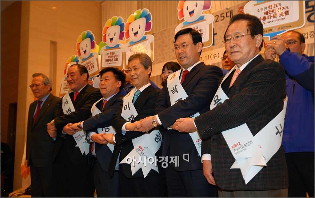 [아시아경제 윤동주 기자] 11일 서울 여의도 중소기업중앙회에서 열린 중앙회 회장 선거 후보자 초청 합동연설회에 참석한 서병문 주물조합 이사장(왼쪽 두번째부터), 박성택 아스콘연합회장, 이재광 전기조합 이사장, 박주봉 철강조합 이사장, 김용구 전 중소기업중앙회 회장이 공명선거 퍼포먼스를 하고 있다.윤동주 기자 doso7@asiae.co.kr<ⓒ세계를 보는 창 경제를 보는 눈, 아시아경제(www.asiae.co.kr) 무단전재 배포금지>