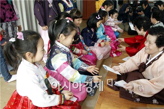 광주 북구 중흥2동 새마을 협의회(회장 임옥기)와 부녀회(회장 마평숙)는 11일 동주민센터 회의실에서 민족의 대명절인 설을 일주일여 앞두고 지역 어르신들을 초청해 설맞이 사랑 나눔 잔치를 열었다. 이날 행사에서 중흥어린이집 원생들이 세배를 하고 어르신들게 세뱃돈을 받고 있다. 사진제공=광주시 북구