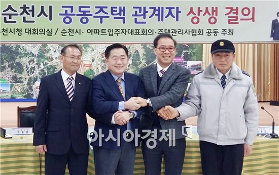 순천시는 12일 순천시청 대회의실에서 아파트입주자대표, 관리소장, 경비원 등 공동주택 관계자 200여명이 참석한 가운데 서로 상생하고 배려하는 새로운 공동체문화를 조성하기 위한 상생다짐 결의행사를 가졌다<br />