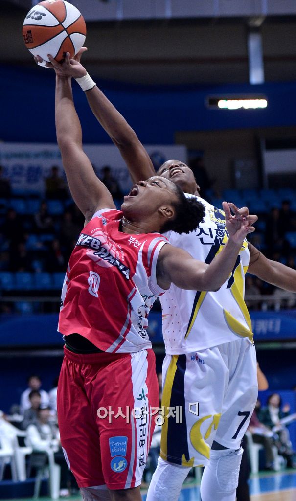 [인천=아시아경제 김현민 기자] 여자 프로농구 인천 신한은행과 부천 하나외환의 경기가 16일 인천 도원체육관에서 열렸다. 하나외환 심스가 상대 크리스마스와 리바운드를 다투고 있다. 김현민 기자 kimhyun81@asiae.co.kr<ⓒ세계를 보는 창 경제를 보는 눈, 아시아경제(www.asiae.co.kr) 무단전재 배포금지>