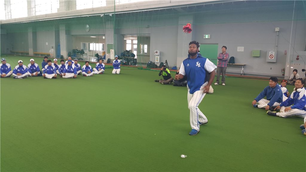 프로야구 삼성이 민족 최대 명절 설을 맞아 제기차기 이벤트를 실시했다. 사진은 야수조로 참가한 외국인타자 야마이코 나바로(가운데)가 제기를 차고 있는 모습.[사진 제공=삼성 라이온즈]
