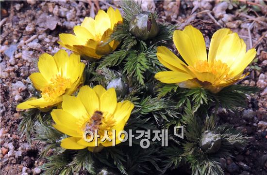 겨울의 끝자락에서 매서운 칼바람을 뚫고 봄의 전령사인 복수초가 얼굴을 내밀며 봄 향기를 물씬 풍기고 있다. <br /> <br /> 연휴 마지막날인 22일 전남 함평군 자연생태공원에는 다양한 들꽃이 자생하고 있지만 복수초가 가장 빨리 피면서 봄을 기다리는 이들의 마음을 설레게 한다.<br /> <br /> 새봄을 알리는 복수초는 '얼음새꽃' '설연화' '원일초' 등의 아름다운 이름을 가지고 있다. 복과 장수를 의미하는 한자어로 구성된 복수초의 꽃말은 '영원한 행복' '슬픈 추억'이다.