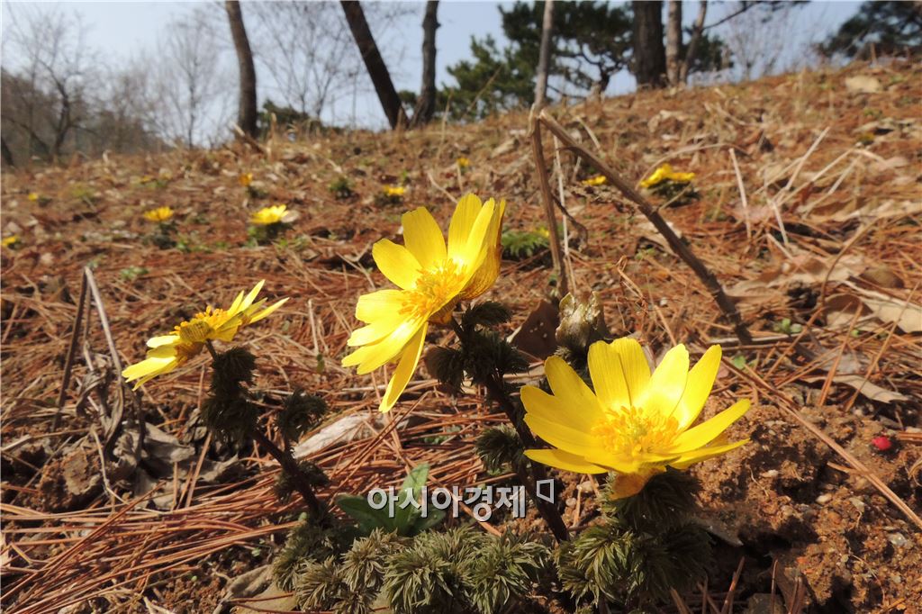 겨울의 끝자락에서 매서운 칼바람을 뚫고 봄의 전령사인 복수초가 얼굴을 내밀며 봄 향기를 물씬 풍기고 있다. <br /> <br /> 연휴 마지막날인 22일 전남 함평군 자연생태공원에는 다양한 들꽃이 자생하고 있지만 복수초가 가장 빨리 피면서 봄을 기다리는 이들의 마음을 설레게 한다. <br /> <br /> 새봄을 알리는 복수초는 '얼음새꽃' '설연화' '원일초' 등의 아름다운 이름을 가지고 있다. 복과 장수를 의미하는 한자어로 구성된 복수초의 꽃말은 '영원한 행복' '슬픈 추억'이다.