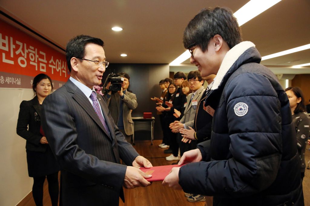 [아시아경제 조인경 기자] 호반건설의 호반장학재단은 25일 광주광역시 KBC방송국 5층 대회의실에서 김상열 이사장(사진 왼쪽) 등 관계자와 장학생 100여명이 참석한 가운데 '2015년 장학금 수여식'을 가졌다.이 자리에서는 올해 신설된 다문화 및 새터민 학생들을 대상으로 한 '레인보우 장학금'을 비롯해 지역 우수인재에게 대학 4년 동안 지원되는 '호반회 장학금', 어려운 환경 속에서도 성실하게 면학에 전념하는 학생들을 지원하는 '꿈드림 장학금' 등 총 670여명의 학생들에게 12억여원의 장학금이 전달됐다.김상열 호반장학재단 이사장은 "다양한 사회공헌 활동을 통해 기업의 이윤을 사회에 환원하고자 한다"며 "이번 장학금을 통해 학생들이 미래의 훌륭한 인재로 성장하는데 보탬이 되길 바란다"고 말했다. 호반장학재단은 호반건설 김상열 회장의 사재 출연으로 설립됐으며, 지난 16년간 6200여명에게 약 100억원의 장학금을 지원해 왔다. 현재 출연자산 145억원, 평가자산 950억원에 달하는 국내 최대 규모의 장학재단 중 하나다.