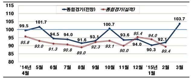BSI가 100을 넘으면 앞으로 경기가 호전될 것으로 예상하는 기업이 더 많다는 의미다. 100미만이면 그 반대다. 지난해 10월 100.7을 기록한 BSI는 11월 이후 4개월 연속 기준치를 넘지 못했다. 전경련은 BSI가 다시 호전된 것에 대해 "전달 대비 조업일수가 느는 등 계절적 요인이 컸고 유로존 불확실성 완화 등이 반영된 결과"라고 설명했다. 유럽중앙은행(ECB)은 지난 1월말, 2016년 9월 혹은 이후까지 매달 600억 유로 상당의 양적완화 시행을 결정한 바 있다. 다만 그간 3월 기업 경기전망치가 다른 달에 비해 높았던 점을 감안하면 여전히 경기 회복을 낙관하기는 이르다는 평가다. 홍성일 재정금융팀장은 "2010년 이후 3월 전망치와 비교하면 올해 3월 전망치는 글로벌 금융위기가 있던 2009년 3월 이후 최저 수준"이라며 "이번 조사에서는 설 명절을 포함한 2월의 기저효과가 있었던 점을 감안해야 한다"고 말했다. 한편 전망치 부문별로는 내수(106.5), 수출(102.7), 채산성(103.8)은 긍정적으로 투자(99.4), 자금사정(97.5), 재고(102.5), 고용(98.1)은 부정적으로 전망됐다. 재고는 100을 넘기면 재고과잉이라는 의미다. 업종별로는 경공업(101.6)과 중화학공업(106.1) 부문에서 각각 섬유·의복 및 가죽·신발(105.3), 석유정제 및 화학제품(123.8) 중심으로 전월 대비 호조세를 전망했다. 기업경기실사지수 2월 실적치는 89.4로 11개월 연속 기준선을 하회했다. 부문별로 보면 내수(88.1), 수출(90.6), 투자(95.6), 자금사정(93.5), 재고(105.8), 고용(97.3), 채산성(93.3) 등 모든 부문에서 부진했다. 김혜민 기자 hmeeng@asiae.co.kr<ⓒ세계를 보는 창 경제를 보는 눈, 아시아경제(www.asiae.co.kr) 무단전재 배포금지>