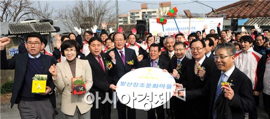 광주광역시와 현대차그룹의 창조경제 협력체인 광주창조경제혁신센터(센터장 유기호)는 26일 오전 서구 양3동 발산마을에서 도심재생사업의 일환으로 발산창조문화마을 발대식을 개최했다. 이날 발대식에서 윤장현 광주시장과 유기호 센터장 김종웅 기아동차 광주공장장, 임우진 서구청장이 사업을 알리는 구호를 외치고 있다.사진제공=광주시