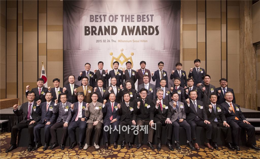 산업통상자원부 후원으로 26일 서울 밀레니엄 힐튼호텔에서 열린 ‘2015 베스트 브랜드상’ 시상식에서 상수도부문 베스트 브랜드상을 수상한 문용운 광주시상수도사업본부 본부장과 각 분문 수상자들이 기념촬영을 하고 있다.<br />