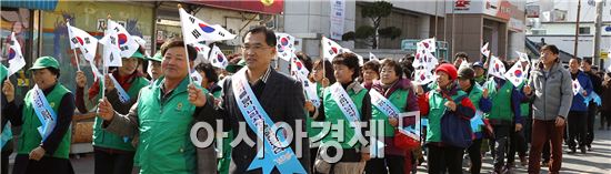 26일 함평군 공무원과 새마을운동중앙회, 자유총연맹, 바르게살기중앙협의회 회원 등 200여 명이 함평읍 시가지를 돌며 태극기달기 운동 캠페인을 펼치고 있다. 사진제공=함평군<br />