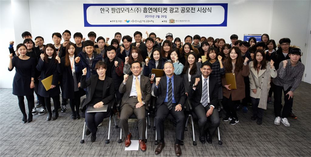 한국필립모리스가 여의도 본사에서 제8회 '흡연 에티켓 광고 공모전' 시상식을 개최했다고 27일 밝혔다. 정일우 한국필립모리스 사장(앞줄 오른쪽 두번째)과 아름다운 세상을 위한 공동체 포럼 최원지 사무국장이 참석자들과 파이팅을 외치며 기념 사진을 찍고 있다.이광호 기자 kwang@asiae.co.kr<ⓒ세계를 보는 창 경제를 보는 눈, 아시아경제(www.asiae.co.kr) 무단전재 배포금지>