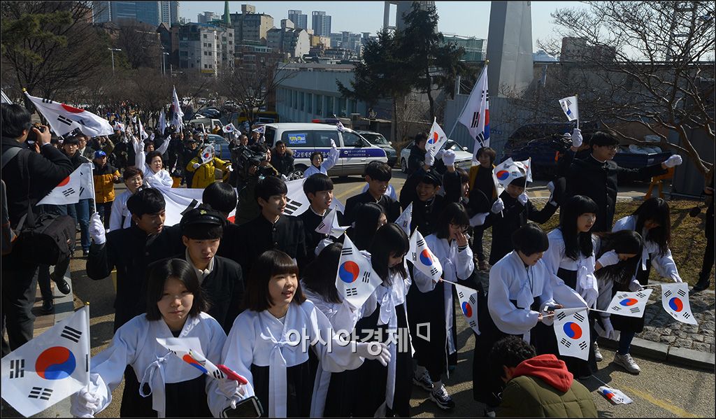 [아시아경제 윤동주 기자] 27일 서울 용산구 효창공원 정문에서 열린 삼일절 만세운동 재현 행사에 참가한 학생들이 만세를 외치며 행진하고 있다.윤동주 기자 doso7@asiae.co.kr<ⓒ세계를 보는 창 경제를 보는 눈, 아시아경제(www.asiae.co.kr) 무단전재 배포금지>