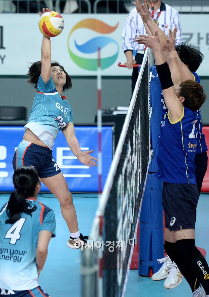 [장충=아시아경제 김현민 기자]여자 프로배구 GS칼텍스와 흥국생명의 경기가 1일 장충체육관에서 열렸다. 경기에 앞서 열린 GS칼텍스 OB팀과 서울시 배구연합회 혼성팀과의 스페셜 매치에서 GS OB 장윤희가 스파이크 공격을 시도하고 있다. GS칼텍스의 전신 호남정유와 LG정유에서 92연승과 슈퍼리그 9연패 신화를 이룬 장윤희, 이도희, 김성민, 홍지연, 박수정 등 한국 여자 배구의 전설들이 총출동한 이 경기에서 GS칼텍스 OB팀이 세트스코어 3대0으로 이겼다. 김현민 기자 kimhyun81@asiae.co.kr<ⓒ세계를 보는 창 경제를 보는 눈, 아시아경제(www.asiae.co.kr) 무단전재 배포금지>김현민 사진기자 kimhyun81@asiae.co.kr<ⓒ아시아 대표 석간 '아시아경제' (www.newsva.co.kr) 무단전재 배포금지>
