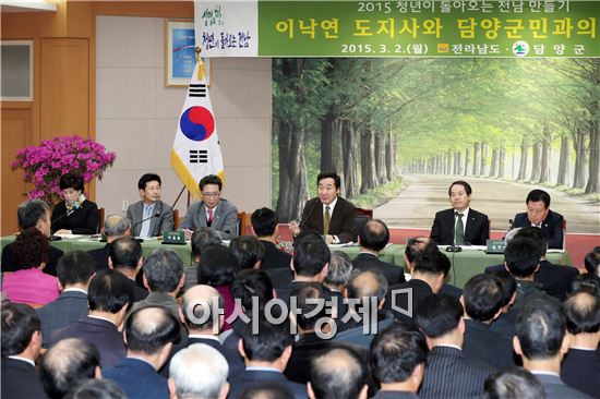 이낙연 전남도지사가 담양군 기관과 사회단체 대표, 주민대표, 공무원 등이 참석해 2일 담양군청에서 열린 첫 도민과의 대화에서 주민의 건의에 답변하고 있다. 사진제공=전남도<br />