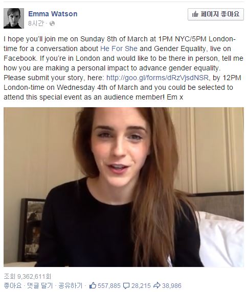 [아시아경제 온라인이슈팀] 영국 배우 엠마 왓슨이 3일 페이스북을 통해 UN 여성 인권 신장 캠페인 '히포쉬(HeForShe)' 대담회를 홍보하며 양성평등을 위한 행보를 이어가고 있다.엠마 왓슨은 런던 시간으로 오는 8일 오후 5시 런던에서 열리는 '히포쉬' 대담회 참석 신청 링크를 연결하고 직접 영상을 통해 참가해 줄 것을 부탁했다. 엠마 왓슨은 이어 런던에 있지 않더라도 대담회는 자신의 페이스북을 통해 중계될 예정이니 양성평등을 위한 질문이나 이야기 등을 올려달라고도 말했다.앞서 엠마 왓슨은 지난해 '히포쉬'의 최연소 여성 친선대사로 임명됐으며 이후 양성평등, 여성 인권신장을 위한 행보를 이어가고 있다. 지난해에는 UN에서 양성평등 관련 연설을 한 바 있다.온라인이슈팀 issue@asiae.co.kr<ⓒ세계를 보는 창 경제를 보는 눈, 아시아경제(www.asiae.co.kr) 무단전재 배포금지>