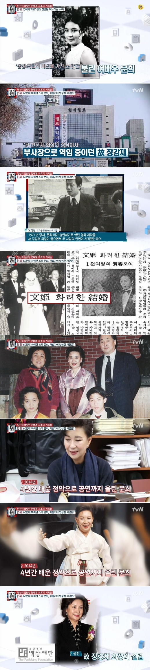 [아시아경제 온라인이슈팀] '최초의 재벌가 며느리'로 꼽히는 영화배우 문희(본명 이순임)의 근황이 공개됐다.지난 2일 방송된 tvN '명단공개 2015'에서는 '당신이 몰랐던 연예계 최초의 기록들' 특집편을 통해 문희를 비롯해 '청담동 며느리' 타이틀을 거머 쥔 연예인들이 소개됐다. 이날 방송에는 배우 심은하와 김희선, 최정윤 및 노현정 전 아나운서가 소개 됐다.문희는 1960년대 고 남정임, 윤정희와 함께 영화계 트로이카로 불리며 동양 최고의 미모라는 찬사를 받았던 배우다.문희는 1971년 영화 '미워도 다시 한번4'로 대흥행을 기록했던 시절 6년 동안 200편이 넘는 영화에 출연하다 결국 '힘들어 도망가고 싶었다'며 은퇴를 선언했다.당시 문희는 결혼 발표를 함께 했는데 예비신랑이 H신문사 대표의 장남이자 부사장으로 역임 중이던 고 장강재로 알려졌다.방송에 따르면 두 사람은 장강재 회장이 영화 제작을 맡으면서 만나 6개월간 연애를 하게 됐고 결국 결혼에 성공해 문희는 1971년 연예계 최초 재벌가 며느리로 입성했다.문희는 이후 슬하에 1남 2녀를 키우며 단란한 가정을 꾸렸지만 47살에 남편을 먼저 떠나보내 2년간 고통스러운 생활을 보냈다.한편 문희는 대학원 공부를 하며 4년 동안 정악을 배워 공연을 하기도 했으며 지금은 고 장강재 회장이 설립한 '백상재단' 장학재단에서 이사장으로 활동 중이다.온라인이슈팀 issue@asiae.co.kr<ⓒ세계를 보는 창 경제를 보는 눈, 아시아경제(www.asiae.co.kr) 무단전재 배포금지>