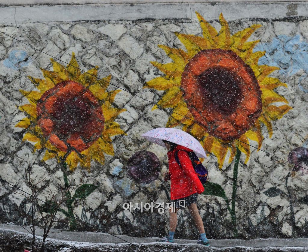 [아시아경제 최우창 기자] 진눈깨비가 내린 3일 우산을 쓴 시민이 홍제동 개미마을에 해바라기가 그려진 벽화 주변을 걸어가고 있다.기상청은 3일 오전 전국이 대체로 흐린 날씨를 보이다 진눈깨비와 비가 그친 뒤 꽃샘추위가 찾아 올 것으로 예보했다.최우창 기자 smicer@asiae.co.kr<ⓒ세계를 보는 창 경제를 보는 눈, 아시아경제(www.asiae.co.kr) 무단전재 배포금지>