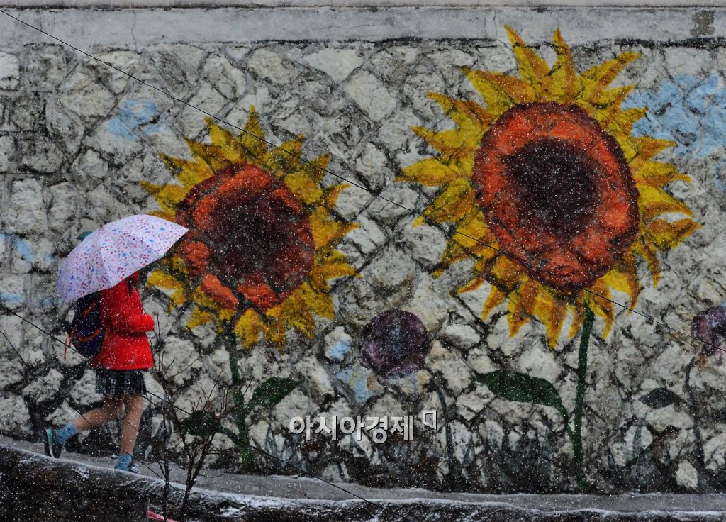 [아시아경제 최우창 기자] 진눈깨비가 내린 3일 우산을 쓴 시민이 홍제동 개미마을에 해바라기가 그려진 벽화 주변을 걸어가고 있다.기상청은 3일 오전 전국이 대체로 흐린 날씨를 보이다 진눈깨비와 비가 그친 뒤 꽃샘추위가 찾아 올 것으로 예보했다.최우창 기자 smicer@asiae.co.kr<ⓒ세계를 보는 창 경제를 보는 눈, 아시아경제(www.asiae.co.kr) 무단전재 배포금지>