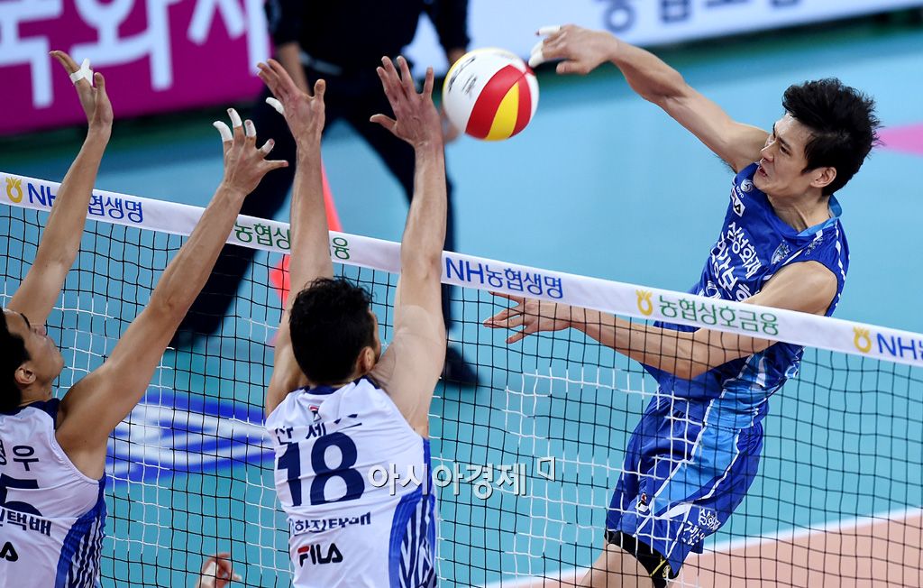 [인천=아시아경제 김현민 기자] 프로배구 V리그 남자부 대한항공과 삼성화재의 경기가 3일 인천 계양체육관에서 열렸다. 삼성생명 이선규가 상대 블로킹을 뚫고 공격하고 있다. 삼성화재는 이 경기에서 이기면 정규리그 4연속 우승을 확정짓는다.김현민 기자 kimhyun81@asiae.co.kr<ⓒ세계를 보는 창 경제를 보는 눈, 아시아경제(www.asiae.co.kr) 무단전재 배포금지>김현민 사진기자 kimhyun81@asiae.co.kr<ⓒ아시아 대표 석간 '아시아경제' (www.newsva.co.kr) 무단전재 배포금지>