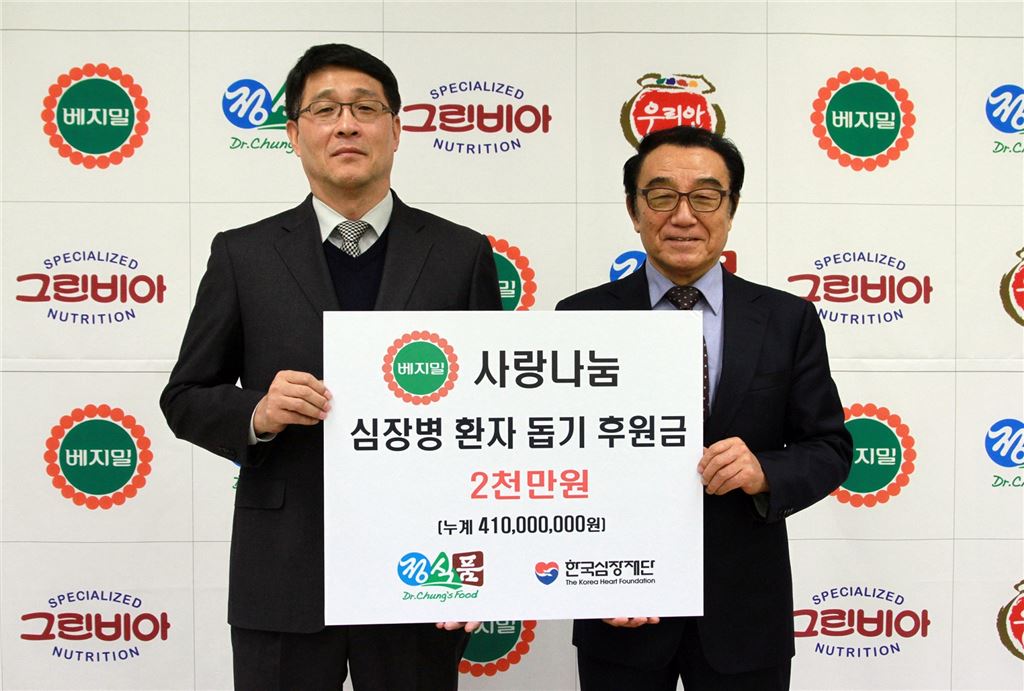 이경재 정식품 영업총괄상무(왼쪽)가 한국심장재단에 심장병 환자 돕기 후원금을 전달한 후 기념촬영을 하고 있다.