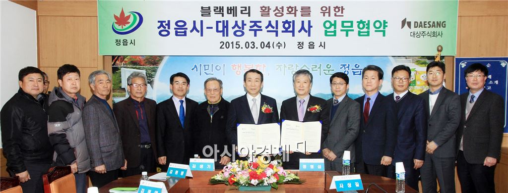 정읍시와 대상주식회사는 4일 시청 2층 영상회의실에서 메이플(정읍블랙베리, 이하 메이플) 소비 촉진을 위한 업무협약을 체결했다. <br />