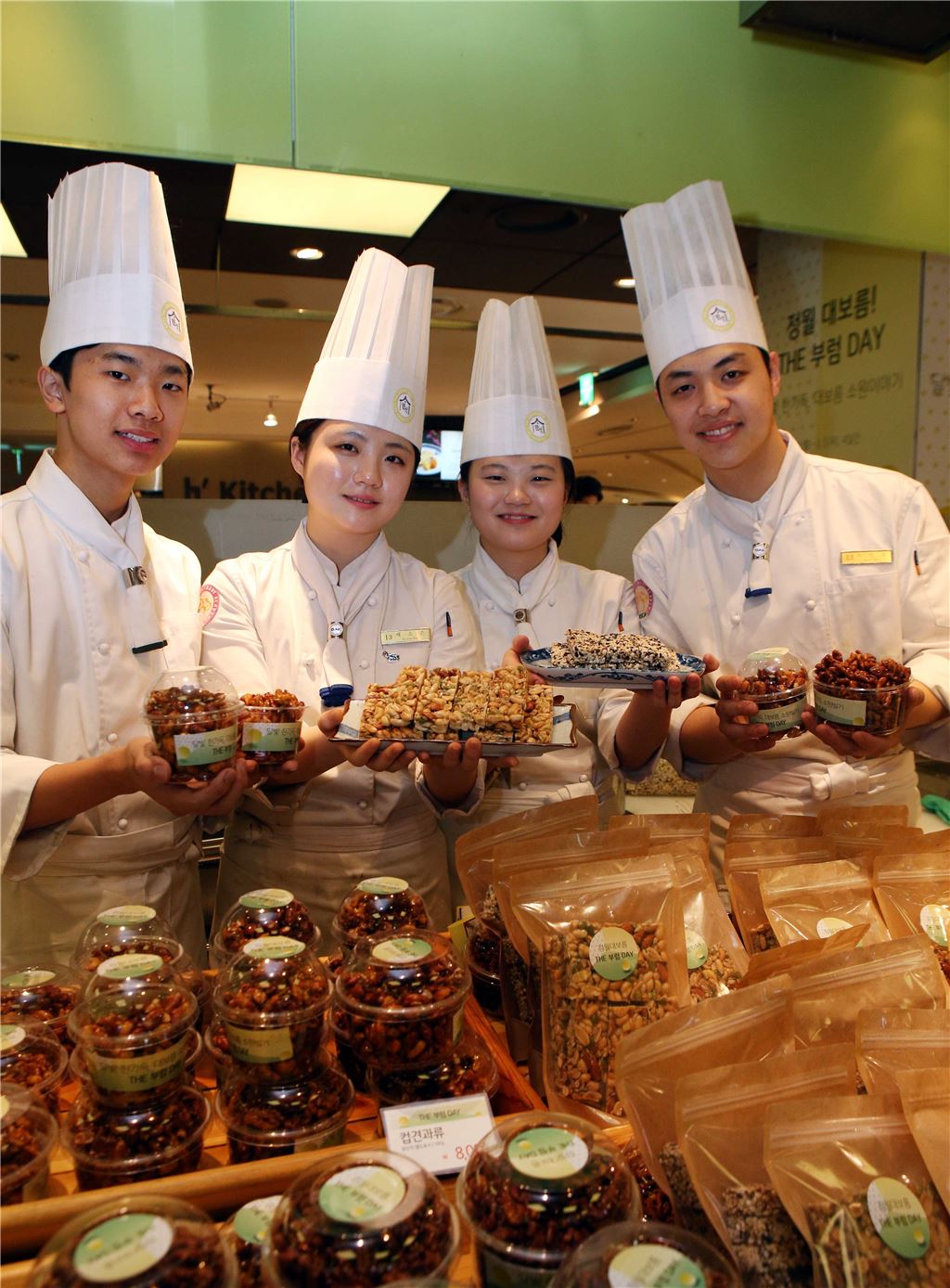 4일 현대백화점 압구정본점에서 우송대학교 '글로벌 한식조리학과' 학생들이 직접 만든 오곡바, 견과류바, 견과류컵 등을 선보이고 있다. (왼쪽부터) 김성우, 배소은, 김선주, 신인호 학생