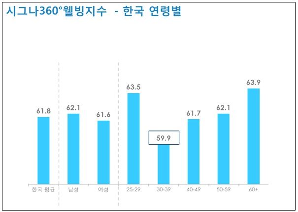 [아시아경제 김대섭 기자] 우리나라 30대의 웰빙지수가 다른 연령대에 비해 가장 낮은 것으로 나타났다. 일명 '낀 세대'로 불리는 30대의 경제적 여건과 불안정한 직장 생활, 불확실한 미래에의 두려움으로 전반적인 웰빙 수준이 낮은 것으로 분석됐다. 4일 라이나생명의 글로벌 본사인 시그나코퍼레이션에 따르면 주요 아시아 태평양지역 국가를 대상으로 '건강과 웰빙' 전반에 관한 동기ㆍ인식ㆍ태도를 추적 관찰한 결과, 한국인 30대의 웰빙지수는 59.9를 기록했다. 다른 연령대가 모두 '61' 이상인 것과 비교하면 낮은 수치다. 30대들은 직장 관련 고민이 가장 큰 것으로 조사됐다. 특히 직장 안정성, 급여, 가정과 일의 균형 등을 묻는 전 항목에서 동일하게 가장 부정적으로 답해 평균 수치보다 모두 적게 나타났다. 또 직장에서 본인의 적성과 산업군에 대한 불만족도 부분에서도 30대가 가장 높았다. 우리나라 30대는 주요 아시아 태평양지역 국가들 가운에 웰빙지수가 가장 낮은 태국의 30대 보다도 지수가 더 낮았다. 한편 웰빙지수는 개인의 전반적인 건강과 웰빙에 영향을 미치는 요인, 동기, 인식, 태도를 지속적으로 확인하고 관찰하기 위해 만든 최초의 연간지수다. 홍콩, 중국, 태국, 한국, 뉴질랜드, 영국을 조사 대상으로 했다. 6개국에서 각각 대표 표본 1000명을 무작위 추출해 온라인 설문조사로 진행했다. 김대섭 기자 joas11@asiae.co.kr<ⓒ세계를 보는 창 경제를 보는 눈, 아시아경제(www.asiae.co.kr) 무단전재 배포금지>