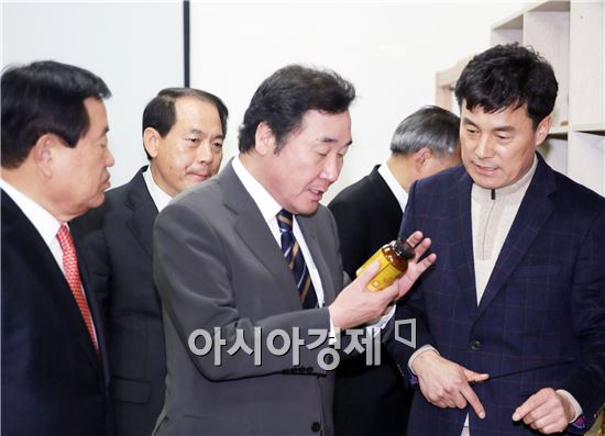 도민과의 대화를 위해 4일 진도를 방문한 이낙연 전남도지사가 진도군 지산면 진도강황영농조합법인을 찾아, 이동진 진도군수와 현황 설명을 듣고 있다. 사진제공전남도