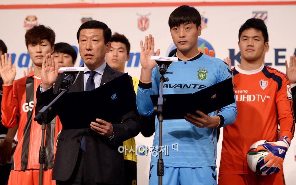 [아시아경제 김현민 기자] 5일 서울 홍은동 그랜드힐튼호텔에서 열린 프로축구 K리그 클래식 2015 미디어데이에서 전북 최강희 감독과 권순태 선수가 축구헌장선서를 하고 있다. K리그 클래식 2015는 오는 7일 작년 시즌 우승팀 전북과 FA컵 우승팀 성남의 공식 개막전을 시작으로 9개월간의 대장정에 돌입한다. 김현민 기자 kimhyun81@asiae.co.kr<ⓒ세계를 보는 창 경제를 보는 눈, 아시아경제(www.asiae.co.kr) 무단전재 배포금지>