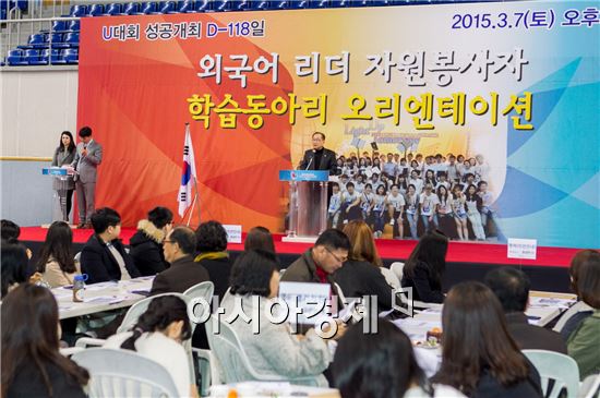 광주U대회 조직위원회는 7일 오후 광주 서구 풍암동 빛고을체육관에서 ‘외국어 리더자원봉사자 오리엔테이션’을 개최했다.