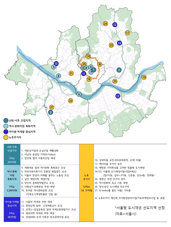 기본 방향 및 실행계획 담은 '서울 도시재생 종합플랜' 첫 발표낙후된 지역에 대해 우선순위 선정 … 집중적인 재생 추진[아시아경제 조인경 기자] 서울시가 향후 도시재생의 추진 모델이 될 '서울형 도시재생 선도 지역' 27곳을 선정하고 1단계로 민간투자 촉진, 통합적 계획수립, 공공 인프라 구축 등에 오는 2018년까지 1조3000억원의 사업비를 투자키로 했다.기존의 일률적인 전면철거 방식이 아닌 계획부터 실행에 이르는 전과정에 주민이 주축이 돼 각 지역의 정체성을 살릴 수 있는 맞춤형 정비방식이 도입될 예정이다. 서울시는 3년간의 준비와 기반 작업 끝에 이같은 내용을 담은 '서울 도시재생 종합플랜'을 9일 발표했다. 민선6기 핵심 키워드인 '도시재생' 사업의 기본 추진 방향을 담고 실행력에 무게를 둔 서울시 최초의 종합적 재생계획이다. 시는 지역 특성과 지속가능성 등을 고려해 27개 선도 지역을 ▲쇠퇴·낙후 산업지역(3개소) ▲역사·문화자원 특화지역(7개소) ▲저이용·저개발 중심지역(5개소) ▲노후주거지역(12개소) 등 4개 유형으로 구분하고 맞춤형으로 재생한다는 방침이다.우선 쇠퇴·낙후산업 지역은 한때 성장을 견인했으나 산업재편 과정에서 활력이 저하돼 기존 생태계를 유지하면서 활로 모색이 필요한 세운상가, G-밸리, 장안평 일대 3곳을 집중 대상지로 삼는다.역사·문화자원 지역은 삶의 흔적이 담긴 지역자원이 제대로 활용되지 못하거나 개발로 훼손돼 이를 보전하면서 관광명소로 활성화시킬 방안이 필요한 세종대로, 마포석유비축기지, 노들섬 등 7곳을 선정했다. 과거 철도역 등 성장을 견인했으나 현재는 지역발전 저해시설로 전락한 서울역, 창동·상계, 영동MICE, 광운대역, 상암·수색 등 5곳은 지역단절을 극복하면서 중심지 기능을 강화해야 할 곳으로 분류됐다.노후지역인 ▲창신·숭인, 가리봉, 장위동 등 뉴타운 해제지역 ▲성곽마을, 백사마을, 해방촌, 북한산주변, 서촌, 암사1동, 성수1·2가동, 신촌, 상도4동 등 지역특성관리지역 12곳에 대해서는 공공지원시스템을 구축해 통합 관리하는 한편, 획일적인 재개발·재건축 방식에서 탈피한 재생모델도 정립할 방침이다. 이를 위해 개인주택 개량을 위한 융자 지원을 강화하고, 한 구역에서 주거환경관리, 가로정비, 주택개량 등 사업을 혼합할 수 있게 한다. 특히 기존 재건축·재개발 사업은 안정적으로 추진될 수 있는 기반을 조성하는 한편, 뉴타운 해제구역의 경우 갈등 수습을 마무리짓기 위한 유형별 맞춤형 대책을 강구한다.서울시는 이들 선도사업에 앞으로 4년간 1조3000억을 투자키로 했다. 또 SH공사를 재생사업 실행을 위한 전문기관으로 지정하고 시와 별도로 재생 사업에 추가적으로 1조원 이상을 투자할 방침이다.SH공사는 동북권의 중요한 광역거점 복합개발 사업인 '창동·상계 신경제 중심지 조성'을 위한 1단계 붐업사업에도 시행자로 참여할 예정이다.이제원 서울시 도시재생본부장은 "저성장 시대, 서울의 재도약을 위한 도전과제인 도시재생의 첫걸음을 떼는 이 시점에서 27개소 선도지역이 도시재생의 모범적 사례가 되도록 추진해 나가겠다"며 "특히 시민과 함께 하는 재생이 돼야 한다는 점을 원칙으로 삼아 100년 서울의 기반을 만들어 나갈 것"이라고 말했다.