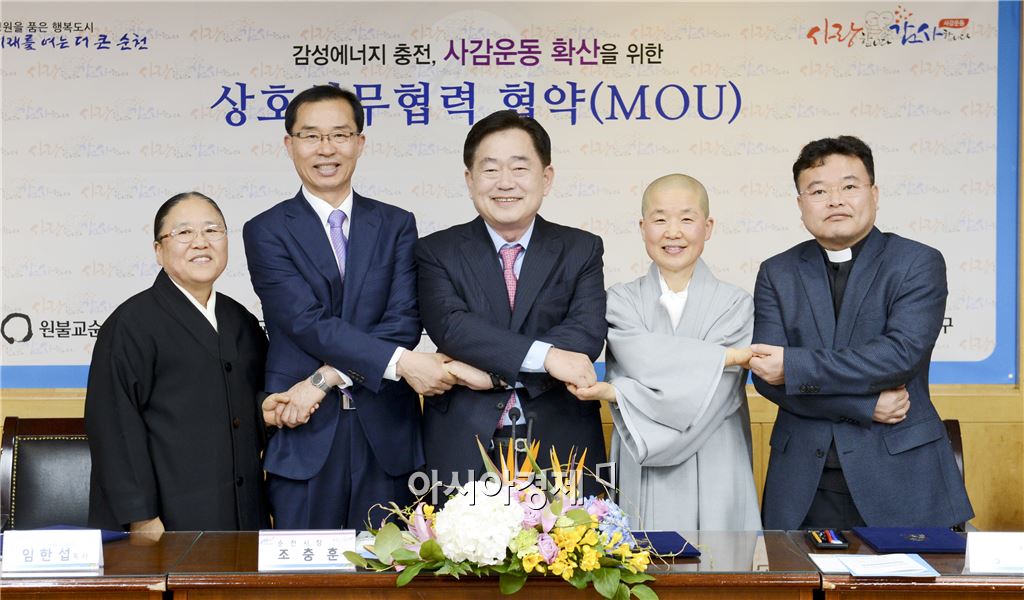 "범시민운동 사감운동 성장 동력 찾아, 한마음"[아시아경제 노해섭 기자]순천시(시장 조충훈)는 9일 시청 소회의실에서 시민 중심의 ‘사랑합니다. 감사합니다 포옹운동(이하 사감운동)’의 저변문화 및 성장 동력을 마련하기 위해 4대 종교단체 대표들과 상호업무협력 협약(MOU)을 체결했다.이날 협약은 최근 우리가 직면하고 있는 ‘인간의 본질적 가치 상실’이라는 사회적인 문제를 사감운동을 통해 그 해결방안을 고찰하고자 추진된 것으로, 그동안 관(官) 중심의 사감운동 전개에서 민(民) 중심의 사감운동 추진 동력을 마련하는 단초가 되었다는데 그 의미가 있다.또한 정원을 품은 행복도시 순천 조성이라는 민선6기 시정목표와 그 맥을 같이한 것으로 사감운동이 아래에서부터 위로 확산되는 지속가능한 시민운동으로 발전할 계기가 마련된 것으로 평가된다. 협약을 체결한 관내 4대 종교단체 대표들은 앞으로 사감운동을 통한 시민 행복문화 창조와 관련한 구심점 역할을 하게 되며 특히 행복시민이라는 동질성 및 공동체의식 함양에 주안점을 두고 노력을 경주할 계획이다.조충훈 순천시장은 ?만 순천 시민 누구나 행복한 행복도시를 위해 4대 종교단체가 가교역할을 감당해 줄 것으로 기대된다”며 “앞으로도 전국 행복지수 1위 순천을 위해 시민과 동반자적 관계를 유지하기 위해 더욱 노력할 것”이라고 말했다. 이에 순천시기독교총연합회 회장으로 참석한 임한섭 목사는 “사감운동의 취지에 적극 공감한다”며 “시민과 호흡하는 사감운동이 될 수 있도록 가교역할을 충실히 해 행복도시 순천을 조성하는데 일조 하겠다”고 답했다.노해섭 기자 nogary@<ⓒ세계를 보는 창 경제를 보는 눈, 아시아경제(www.asiae.co.kr) 무단전재 배포금지>