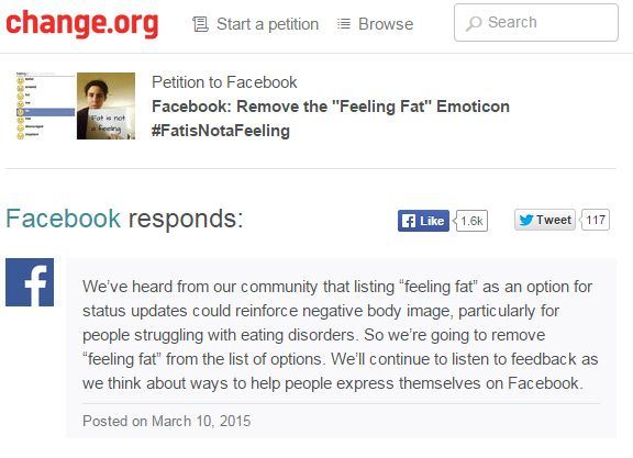 [아시아경제 이지은 기자] 페이스북의 감정표현 중 하나인 '살찜(fat)'이 온라인서 반발을 일으키자 페이스북이 결국 삭제를 결정했다. 11일(현지시간) 미국 정보기술(IT)매체인 더버지는 페이스북이 이 감정표현을 삭제하기로 했다고 보도했다. 페이스북은 친구의 게시물에 '기분 좋아졌음(better)' '놀라움(amazed)' 등 다양한 이모티콘을 통해 감정을 표현할 수 있도록 하고 있는데 이 중 살찜 이모티콘이 네티즌들의 반감을 불러일으켰다. 이들은 "살찜은 감정이 아니다"며 "페이스북의 살찜 표현은 스스로의 몸에 대한 부정적 이미지를 증폭시킬 수 있다"고 주장하고 있다. 일부 네티즌이 온라인 청원 사이트(www.change.org)에 살찜 표현 삭제를 요청하는 게시글을 올리자 이에 공감하는 사람들이 줄을 잇기 시작했다. 이날 현재 1만6771명이 살찜 표현 삭제에 찬성의 뜻을 표하고 갔다. 페이스북은 지난 10일 이들에게 답변을 보내 살찜 표현을 삭제하겠다고 약속했다. 페이스북 측은 "살찜 표현에 대한 반감이 일고 있다는 것을 들었다"며 "앞으로도 사람들이 자신의 감정을 잘 표현할 수 있도록 고객의 의견에 대한 피드백을 충실히 할 것"이라고 밝혔다. 이지은 기자 leezn@asiae.co.kr<ⓒ세계를 보는 창 경제를 보는 눈, 아시아경제(www.asiae.co.kr) 무단전재 배포금지>