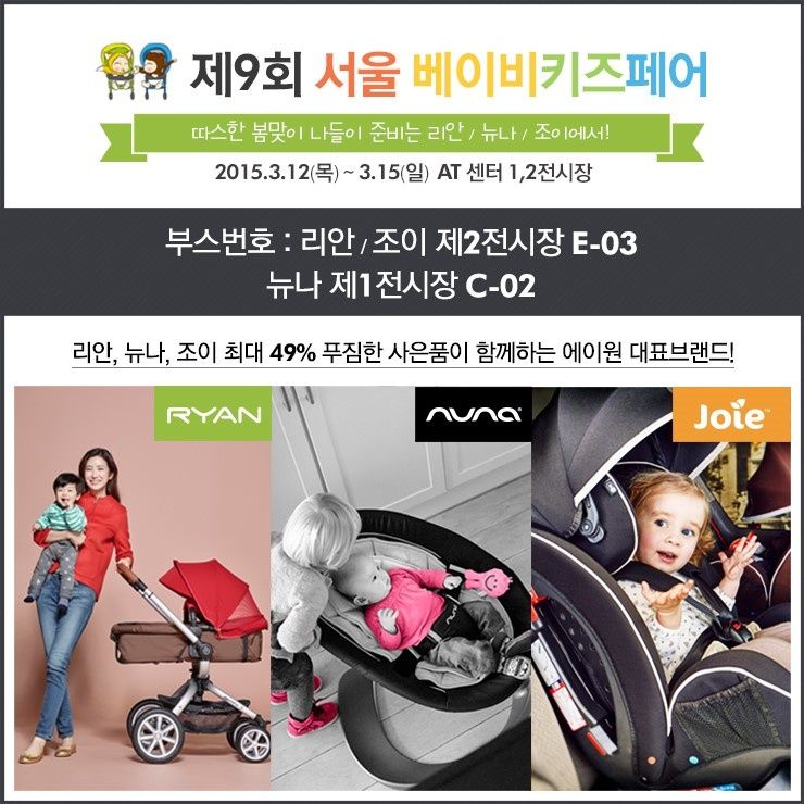 [아시아경제 조강욱 기자] 육아용품 전문기업 에이원은 오는 15일까지 사흘간 서울 양재동 aT센터에서 열리는 '제9회 서울 베이비키즈페어'에 참가해 최대 49% 파격 할인 판매를 진행한다고 13일 밝혔다. 에이원은 이번 행사에서 자사에서 선보이고 있는 국산 유모차 브랜드 '리안(RYAN)'을 비롯해 영국 안전 카시트 '조이(Joie)', 네덜란드 프리미엄 육아용품 '뉴나(NUNA)' 등이 참여해 인기 제품을 선보인다. '소비자가 선정한 최고의 브랜드 대상' 3년 연속 수상으로 믿을 수 있는 유모차 전문 브랜드 리안은 이번 박람회에서 최대 40% 할인판매를 진행한다. 리안의 대표 디럭스 유모차 '스핀LX'와 초경량 디럭스 유모차 '솔로(Solo)'를 비롯해 스핀LX 유모차와 호환해 사용할 수 있는 신생아 카시트 '스핀 인펀트'를 선보인다. 또 리안 제품 구매시 풋머프와 이너시트, 캐리콧 커버, 방풍커버, 바퀴커버, 오가닉팩토리 목쿠션 등 사은품 6종을 무료로 증정한다. '2015 대한민국 퍼스트 브랜드 대상'을 수상한 영국 1등 안전 카시트 브랜드 '조이(Joie)'는 이번 박람회에서 최대 38%의 할인율을 적용해 판매한다. 신생아부터 7세까지 장착 가능한 '스테이지스'와 '스테이지스LX' 카시트를 비롯해 '스테이지스' 아이소픽스형 제품도 함께 선보인다. 아울러 주니어 카시트 '트릴로'와 국내에서 유일하게 2018년부터 시행되는 유럽의 안전기준인 아이사이즈(i-size)를 통과한 '아이앵커'도 함께 판매한다. 조이 카시트 구매시 오가닉 어깨벨트 커버를 사은품으로 증정한다. 네덜란드 프리미엄 육아용품 브랜드 '뉴나(NUNA)'는 완판 행렬을 이어가고 있는 프리미엄 유아 바운서 '리프(Leaf)'와 육아 예능 단골 출현 상품 아기 식탁의자 '째즈(ZAAZ)'를 비롯해 그랜드 디럭스 유모차 '이비(IVVI)'와 절충형 유모차 '페프럭스(PEPP LUXX)' 등을 선보인다. 이와 더불어 페프럭스와 이비 유모차의 트래블 세트와 리프 바운서 토이바 세트 등의 상품을 선보이고, 무료 사은품도 함께 증정한다..한편, '제9회 서울 베이비키즈페어'에서 리안과 조이는 양재동 aT센터의 제2전시장 E-03 부스에서, 뉴나는 제1전시장 C-02 부스에서 만나볼 수 있다.조강욱 기자 jomarok@asiae.co.kr<ⓒ세계를 보는 창 경제를 보는 눈, 아시아경제(www.asiae.co.kr) 무단전재 배포금지>조강욱 기자 jomarok@asiae.co.kr<ⓒ아시아 대표 석간 '아시아경제' (www.newsva.co.kr) 무단전재 배포금지>