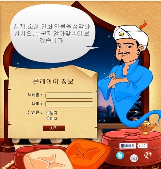 [아시아경제 온라인이슈팀] 응답자가 생각한 인물을 간단한 질문으로 추측해 맞히는 '아키네이터'가 인기를 끌고 있다. 최근 각종 온라인 커뮤니티에는 '신기한 웹사이트'라는 제목으로 각종 특이한 홈페이지가 소개됐다. 이 중 '아키네이터(//kr.akinator.com)'는 자신이 마음 속으로 생각한 실제 인물이나 소설, 만화책 등에 등장한 캐릭터를 간단한 질문을 통해 맞히는 사이트다. 데이터베이스를 응용해 정답을 점차 좁혀가는 형식으로 설계됐다. 게임 방법은 간단하다. 플레이어가 실제 또는 가상의 인물을 마음속에 생각한다.이어 나이를 입력하면 지니가 "여자입니까?" "30세 이상입니까?" 등의 질문을 한다. 플레이어는 이 질문들에 "예","아니오","모르겠습니다","그럴겁니다","아닐겁니다"로 대답할 수 있다. 지니는 20개 정도의 간단한 질문만으로 플레이어가 생각한 인물이나 캐릭터를 맞힌. 대상은 세계 유명 인사뿐 아니라 만화, 애니메이션에 등장하는 가공의 인물까지 모두 포함돼 있다.만약 지니가 인물을 맞추지 못할 경우에는 30개의 질문을 하고 그래도 다른 인물이 나오면 총 40개의 질문을 한다. 플레이어가 떠올린 인물을 지니가 연속으로 틀릴 경우에는 항복하게 된다. 데이터베이스에 입력되지 않은 인물의 경우 이용자가 직접 새 데이터를 입력할 수 있다.질문에 제대로 대답한다면 정답률이 매우 높아 '아키네이터'를 접한 네티즌들 사이에서는 신기하다는 반응이 연이어 나오고 있다. 한 네티즌은 자신의 어머니를 생각하며 게임을 했다가 '당신의 어머니'라는 정답이 나와 놀랐다는 에피소드도 전해진다. 한편 아키네이터는 영어, 프랑스어, 독일어, 히브리어, 포르투갈어, 이탈리아어, 스페인어, 아랍어, 러시아어, 중국어, 한국어, 일본어, 터키어 등 13개 언어로 서비스되며 스마트폰 앱을 통해서도 참여할 수 있다. 온라인이슈팀 issue@asiae.co.kr<ⓒ세계를 보는 창 경제를 보는 눈, 아시아경제(www.asiae.co.kr) 무단전재 배포금지>