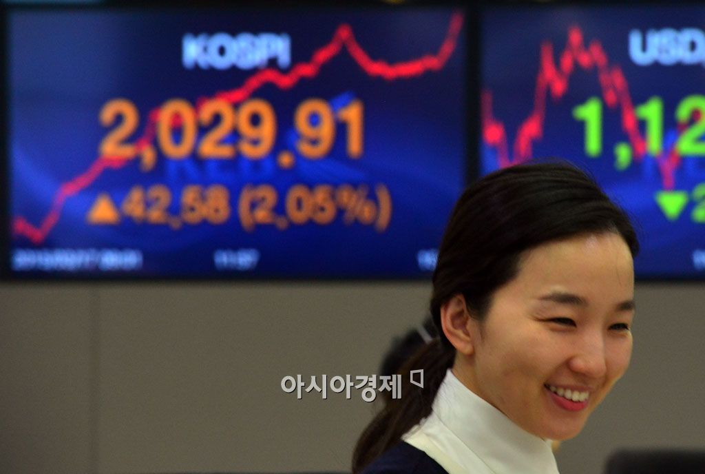 [아시아경제 백소아 기자] 17일 서울 중구 외환은행 본점 딜링룸 전광판에 코스피 지수가 42.58p 오른 2029.91p를 나타내고 있다. 지난해 9월 이후 6개월 만에 2020선을 회복한 코스피는 외국인과 기관의 쌍끌이 매수세가 오후 들어 강해진 덕에 지수 상승폭이 2%를 넘었다.백소아 기자 sharp2046@asiae.co.kr<ⓒ세계를 보는 창 경제를 보는 눈, 아시아경제(www.asiae.co.kr) 무단전재 배포금지>