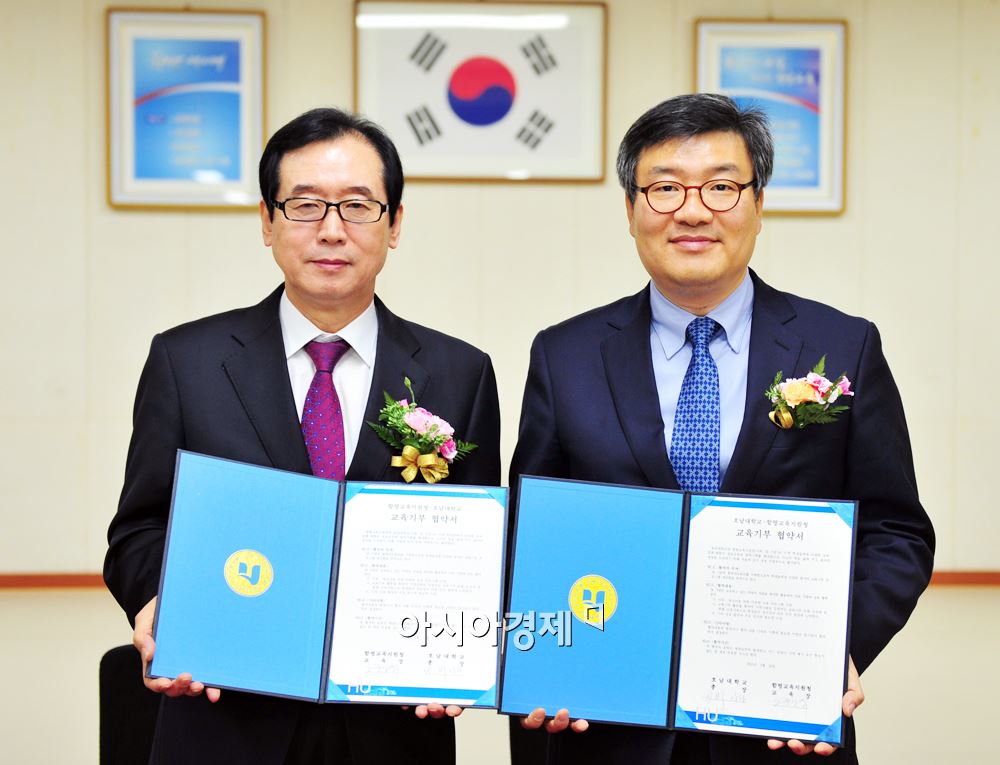 함평교육지원청 노형석 교육장(왼쪽)과 호남대학교 박상철 부총장이 협약을 체결하고 기념사진을 촬영하고있다.