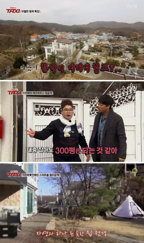 [아시아경제 온라인이슈팀] 배우 이천희 전혜진 부부의 신혼집이 공개됐다.17일 오후 방송된 케이블채널 tvN '현장토크쇼 택시'에는 배우 이천희가 출연해 아내인 배우 전혜진과의 러브스토리, 신혼집, 직접 작업하는 가구 공방을 공개했다.이날 방송에서 경기도 광주에 위치한 이천희의 집을 찾은 MC 오만석과 이영자는 "집이 저택이네" "대충 잡아도 300평은 되는 것 같다"며 당황하는 모습을 보였다.이영자는 이어 "어떻게 이렇게 넓은 집에 사나"고 물었고, 이에 이천희는 "내 집은 아니고 전세다. 아내가 마당에서 아이와 놀고 싶다고 해서 이 집을 골랐다"고 답했다.온라인이슈팀 issue@asiae.co.kr<ⓒ세계를 보는 창 경제를 보는 눈, 아시아경제(www.asiae.co.kr) 무단전재 배포금지>