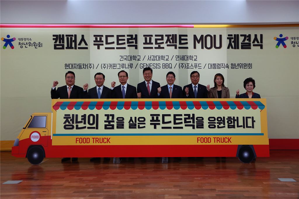 제너시스BBQ를 비롯해 대통령 직속 청년위원회, 참여 기업 및 대학교 관계자들이 '캠퍼스 푸드트럭 프로젝트' 양해각서(MOU) 를 체결하고 기념촬영을 하고 있다.