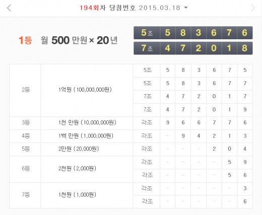 [아시아경제 온라인이슈팀] 연금복권 194회 1등 당첨번호가 '5조583676번'과 '7조472018번'으로 결정됐다. 당첨금은 매달 500만원씩 연금형식으로 지급된다. 18일 나눔로또는 연금복권520의 194회차 1등 당첨번호가 '5조583676번'과 '7조472018번'으로 결정됐다고 밝혔다.1등 당첨금은 매달 500만원씩 20년간 연금 형식으로 지급되며 세금을 뗀 실 수령액은 약390만원이라고 알려졌다. 2등 당첨번호는 각 1등 맨 끝자리에 1을 더하고 뺀 총 4개 번호다. 2등에게는 1억원의 당첨금이 지급된다. 3등은 각조 966776번으로 1000만원의 당첨금이 주어지고, 4등은 각조 끝자리 94213번으로 당첨금은 100만원이다.연금복권은 전국 복권판매점 및 인터넷(www.nlotto.co.kr)에서 구매할 수 있으며 당첨금은 5만원 이하는 복권판매점에서, 5만원 이상 1억원 미만은 농협은행 전국지점에서, 1억원 이상은 나눔로또㈜에서 받을 수 있다.온라인이슈팀 issue@asiae.co.kr<ⓒ세계를 보는 창 경제를 보는 눈, 아시아경제(www.asiae.co.kr) 무단전재 배포금지>