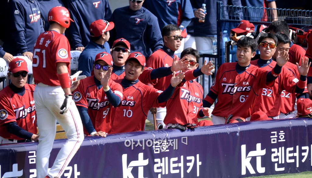 [잠실=아시아경제 김현민 기자]프로야구 2015 KBO리그 KIA 타이거즈와 두산 베어스의 시범경기가 19일 잠실구장에서 열렸다. 5회초 2사 2루에서 KIA 필이 동점 1타점 3루타때 득점을 올린 2루주자 김원섭이 동료들의 환영을 받고 있다. 김현민 기자 kimhyun81@asiae.co.kr<ⓒ세계를 보는 창 경제를 보는 눈, 아시아경제(www.asiae.co.kr) 무단전재 배포금지>